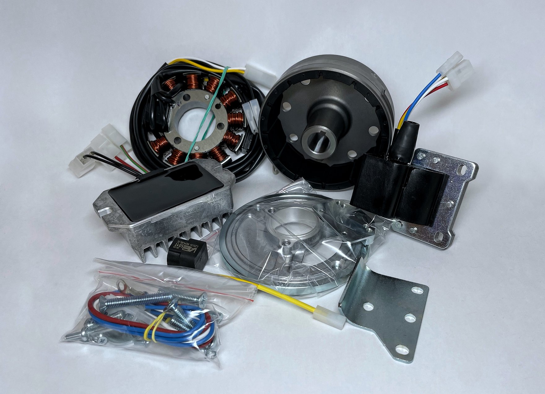 12V zdrojová a zapalovací souprava, pro jednoválcové, dvoutaktní, pravotočivé motory.